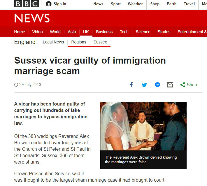 Back in 2010, a Sussex Vicar was found guilty after being involved in hundreds of sham marriages that were all aimed at bypassing the immigration law. According to Crown Prosecution service, it was probably the biggest case of sham marriages in the UK that had ever brought to the court till that date.