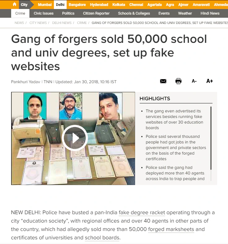 In India, The Times of India reported another such incident in January 2018 where Delhi police busted a fake degree racket that was operating through an education society and had regional offices set up in other parts of the country as well. Operating with more than 40 agents, the forgers had sold more than 50000 certificates and mark sheets from different school boards and universities.