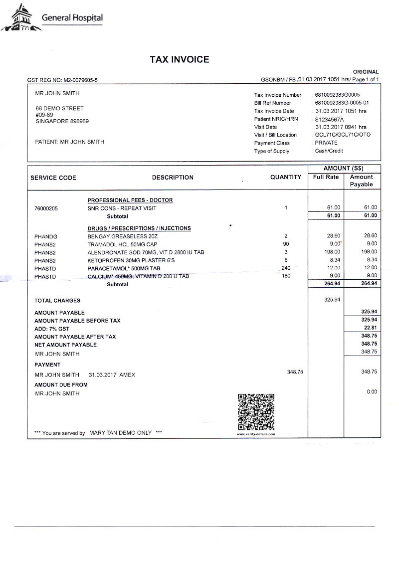 Fortunately with Qryptal’s secure QR code technology it is possible to generate a QR code which can capture the key details of any medical bill or invoice at the time of production and digitally sign it with the private key of the issuer. See an example of such a bill below
