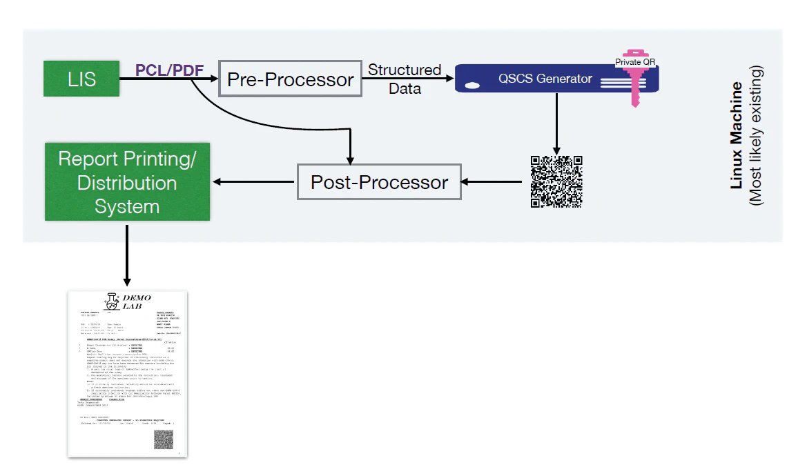 We have had extensive experience in working with such systems to extract the relevant data to be secured in a digitally signed QR and to place the QR on the Covid test report. The process flow diagram below illustrates the solution. The Qryptal solution provides a FilesAPI that allows for integration with LIS systems using the file system to secure the Covid test reports (PCL/PDF formats) produced by such systems