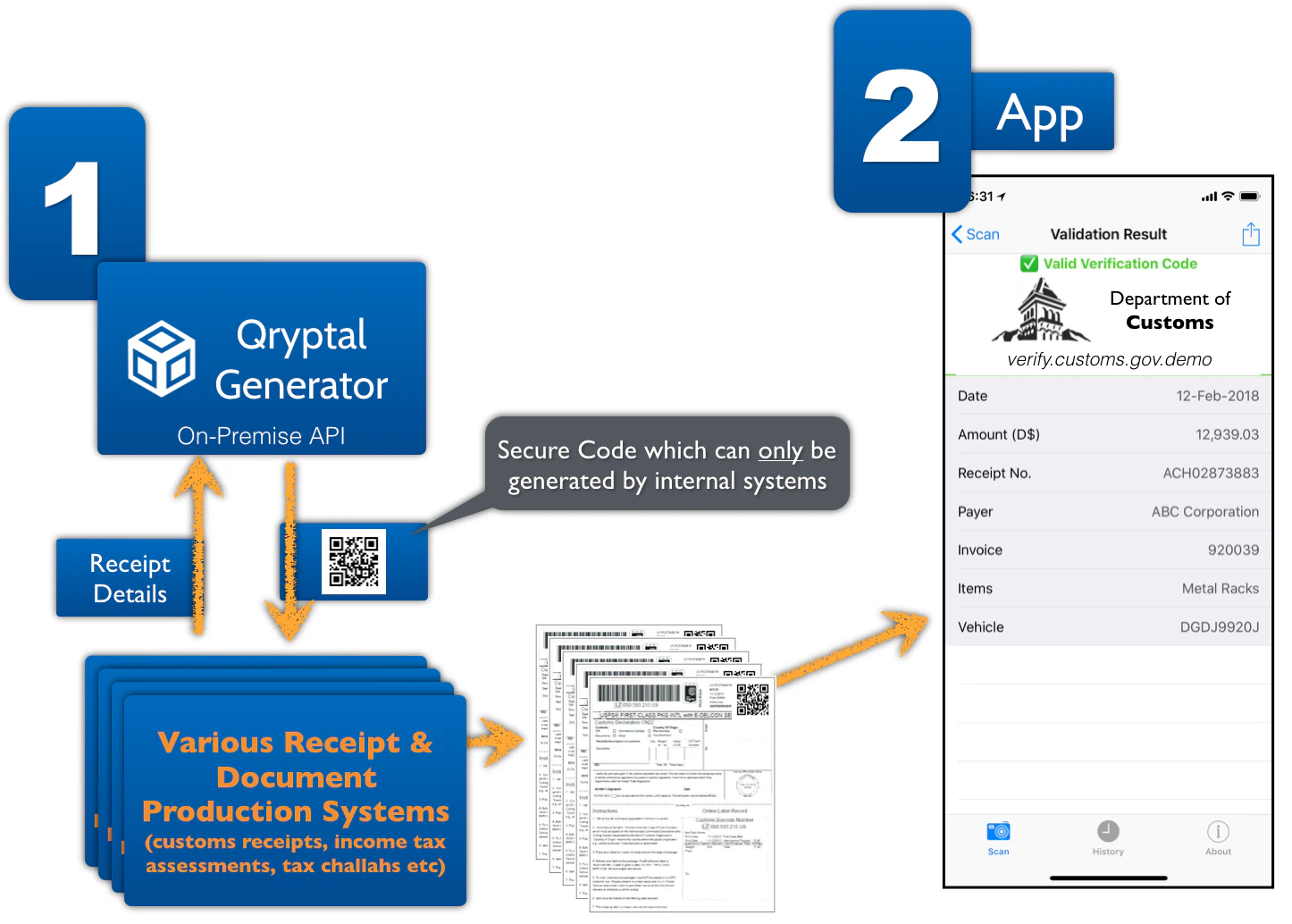 With the Qryptal Secure QR Code on receipts and taxation documents, any officer or member of the public can instantly validate the document