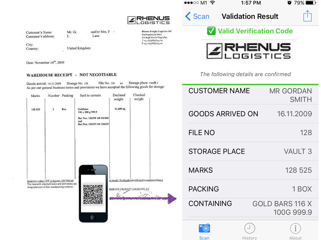 Here is a sample of a warehouse receipt which is powered by the Qryptal QR code, with the relevant details being made available on scanning