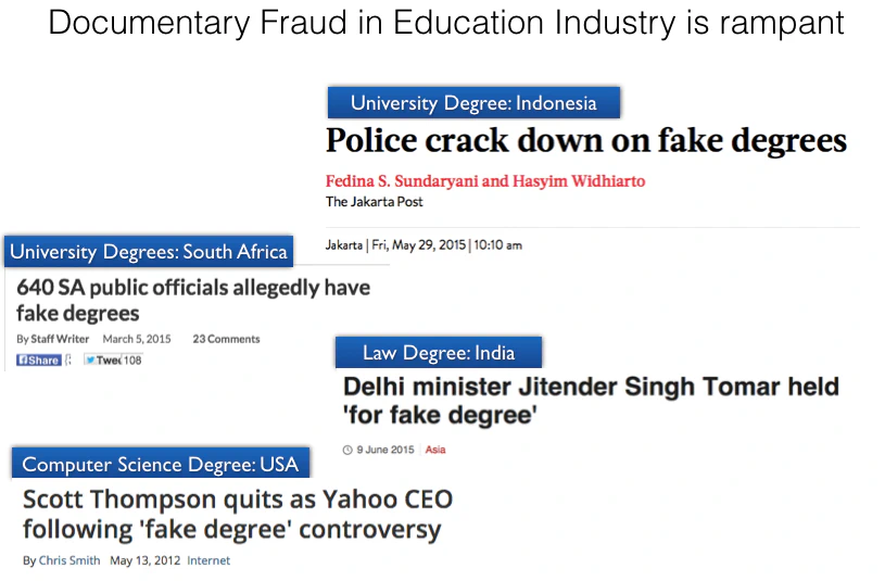 The ability to trust these documents and the information contained in them is essential to establish a person’s credentials and to help in making the right selection. Educational document fraud is very rampant and is typically done to improve credentials and eligibility for opportunities which would otherwise be denied to the candidate.